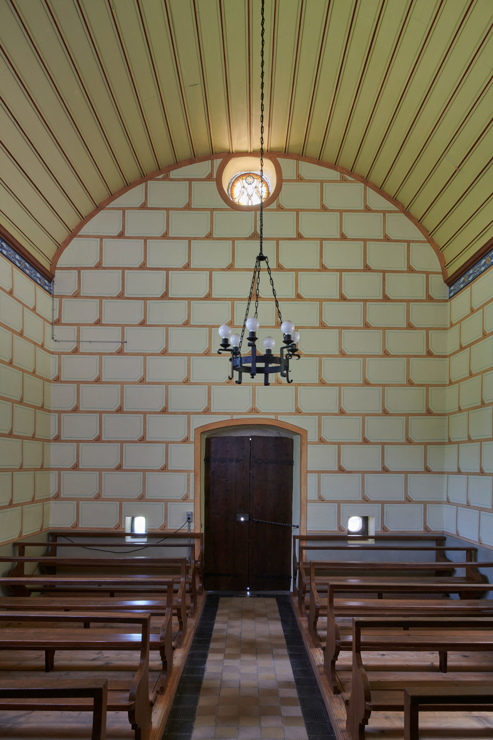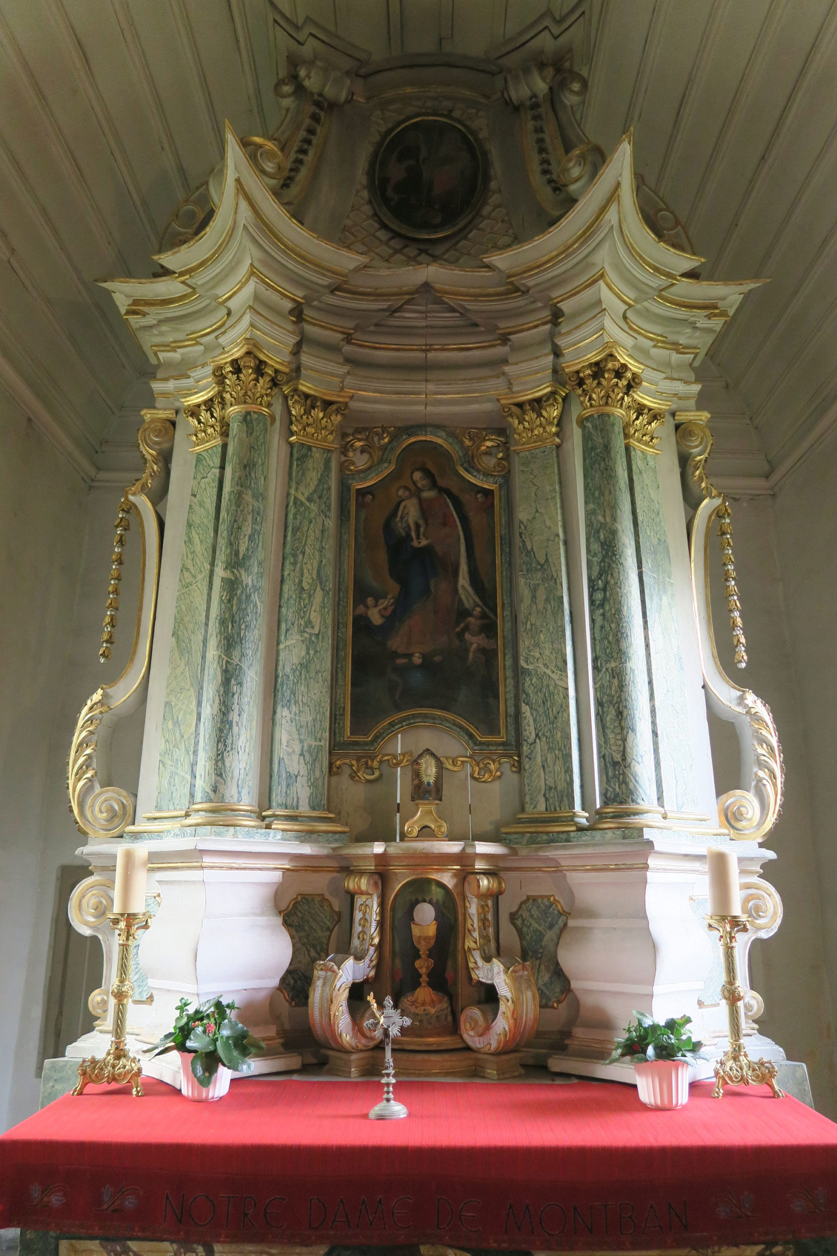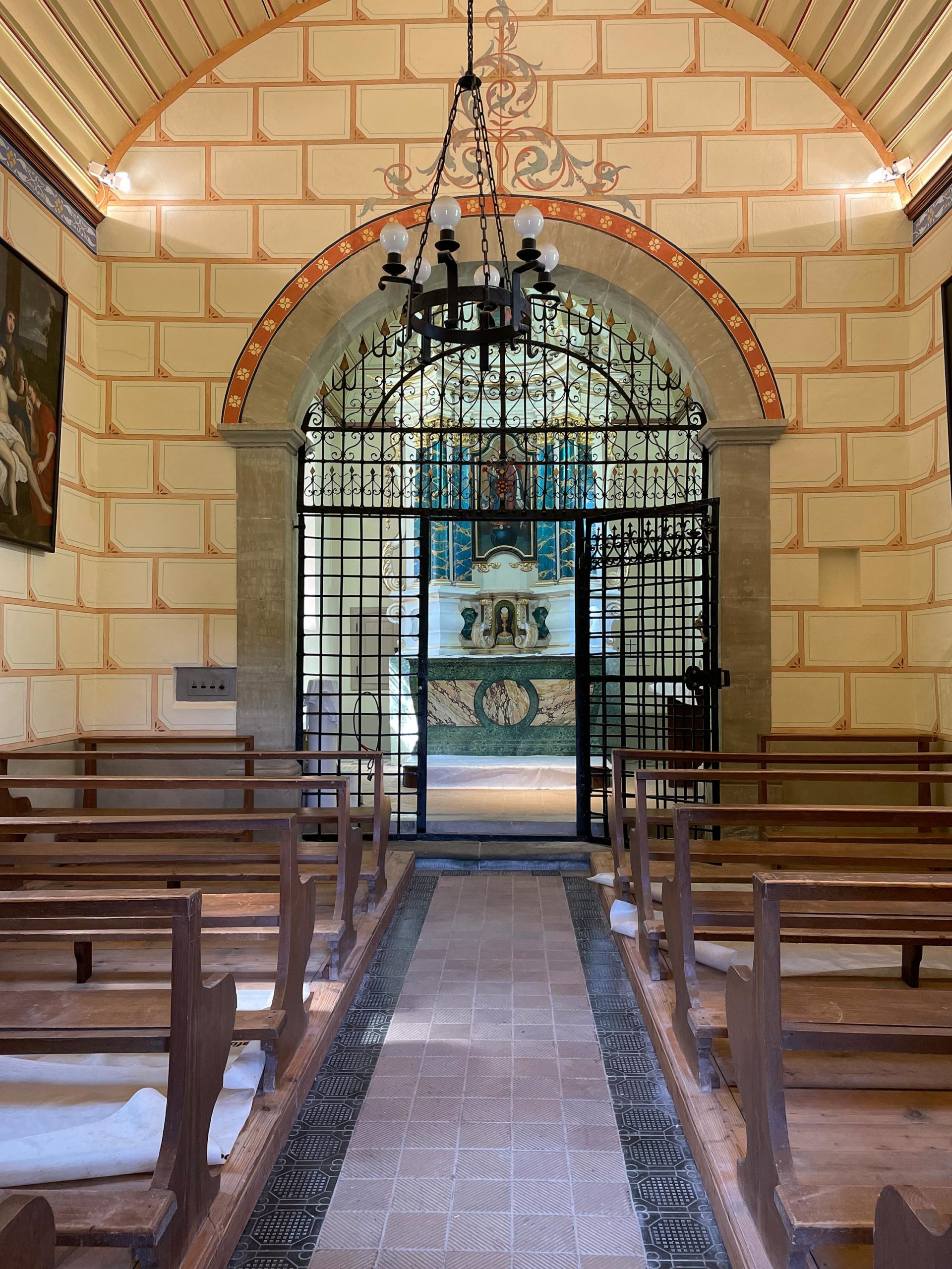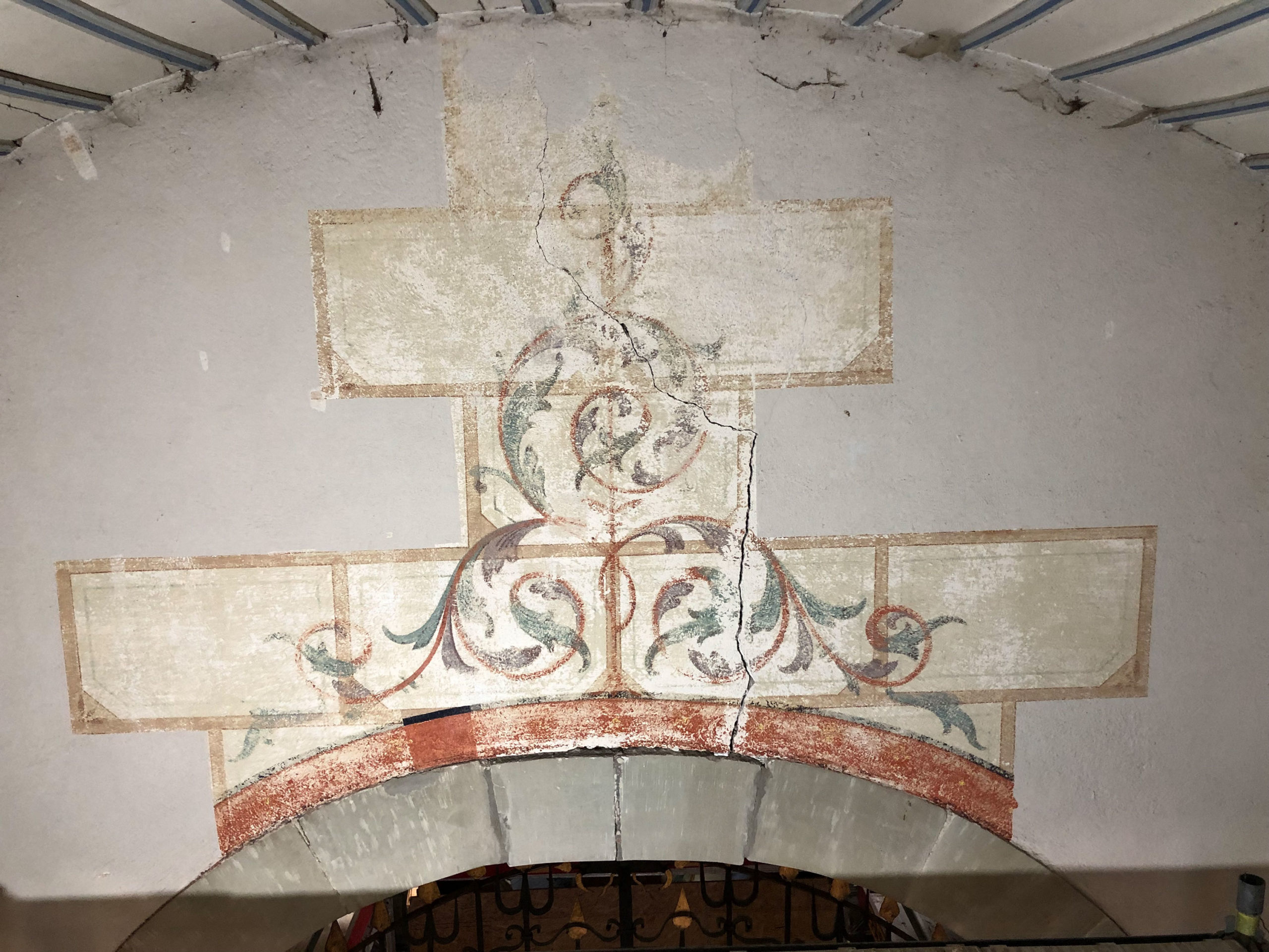 Description : La chapelle de Montban a été construite en 1727 au cœur du village de Farvagny-Le-Grand. Avant tout travaux, l’ensemble de l’intérieur de la chapelle était peint en blanc et les premiers sondages de 2021 ont révélé la présence d’un décor peint sous-jacent datant du tout début du XXème siècle. Ces découvertes nous ont permis de reconstituer fidèlement le décor, avec son faux-appareil, ses frises végétales de corniche et d’encadrement, et ce couronnement végétal au-dessus de l’arc triomphal.