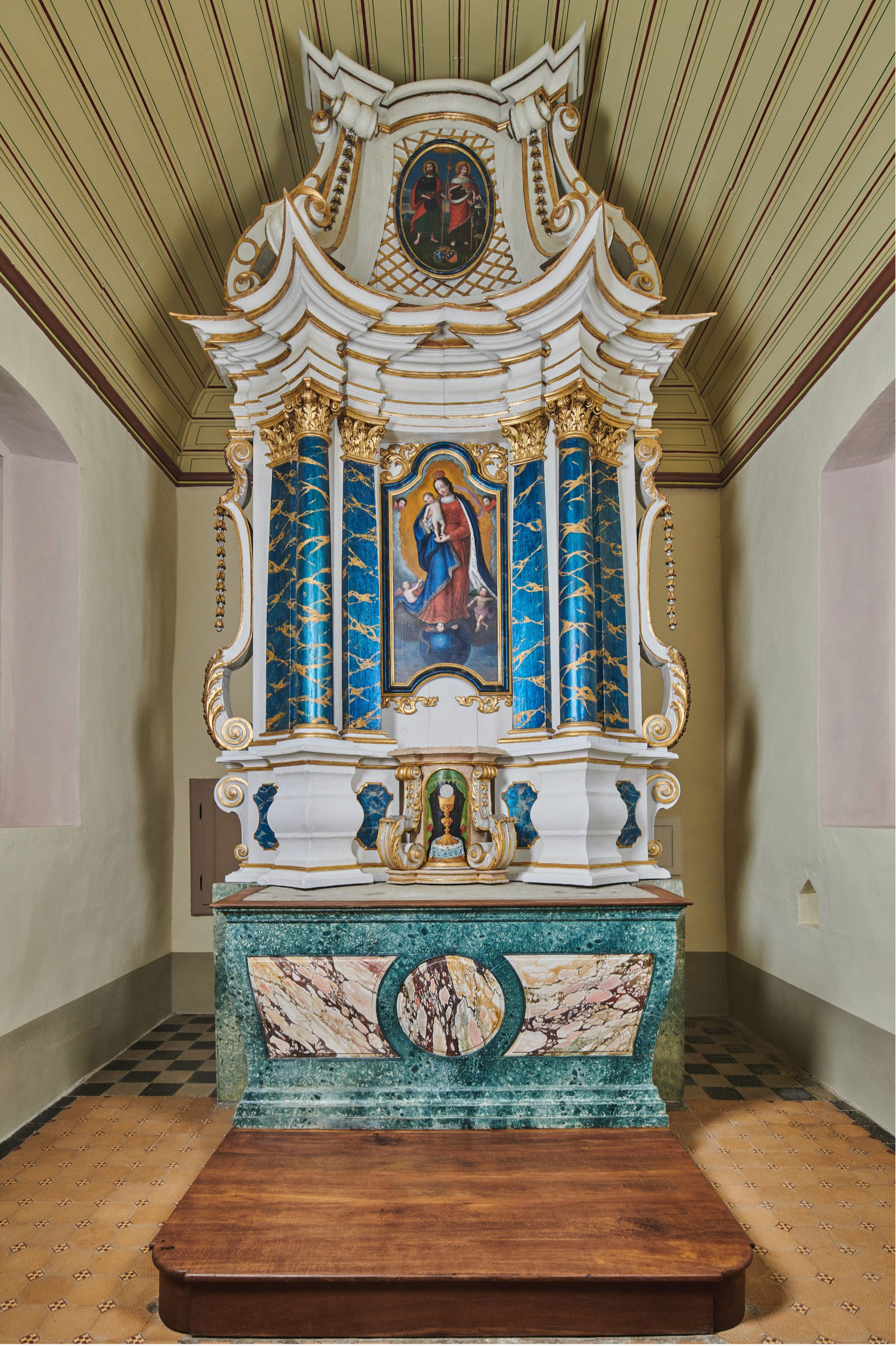 Le maître-autel en bois polychrome date de 1732, sa confection est attribuée à l’atelier Godel de Fribourg et sa polychromie à Antoine Bräutigam de Bulle. La polychromie originale sous la polychromie actuelle datant de 1904 a été documentée lors des sondages exploratoires de 2011 : il s’agit d’un somptueux faux-marbre réalisé au moyen d’un fond en feuille d’argent recouvert d’un lustre bleu avec des veines à la feuille d’or qui recouvre les colonnes, les pilastres, les cadres des tableaux, le tabernacle et les cartouches de l’antependium. La polychromie d’origine a été mise au jour compte tenu de sa remarquable qualité et bon état de conservation. Les tableaux du retable attribués aux sœurs Marguerite-Agnès et Jeanne-Gertrude Richard (1732-173) ont été restauré : l’élimination du vernis a permis de redonner aux couleurs des tableaux tout leur splendeur et vivacité.